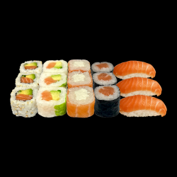 8 Dragon roll 6 saumon roll cheese 6 maki saumon 6 maki concombre cheese 6 california saumon avocat concombre 6 spring roll saumon avocat menthe coriandre 4 sushi saumon 4 sushi thon 2 sushi crevette 2 sushi saumon avocat sésame